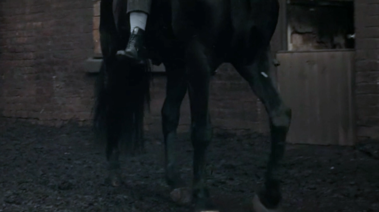 From a blacked out screen we hear the quick clip clop of a horse’s hooves.