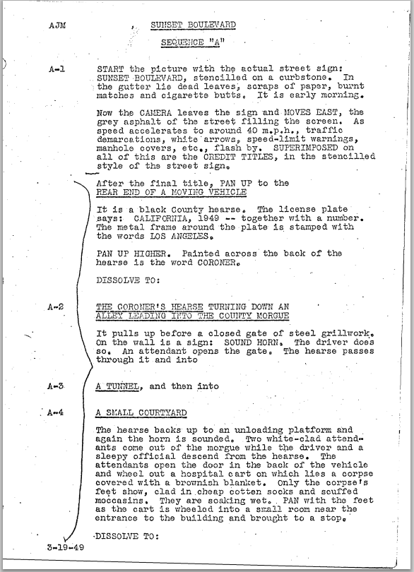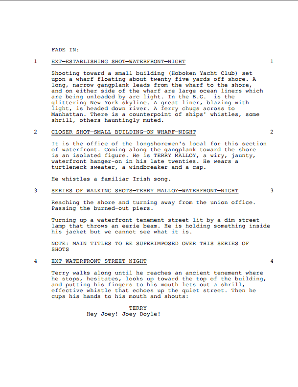 This week’s lecture, The History of Screenwriting focused on how screenwriting has developed and gave two examples from screenplays written in the 1950’s – On the Waterfront (1954 – dir. Elia Kazan, screenplay Budd Schulberg) and Sunset Boulevard (1950 – dir. Billy Wilder, screenplay Charles Brackett, Billy Wilder, D.M Marshman). Finnegan noted “There are noticeable differences in terms of their formatting, despite only being made four years apart.” – At the Crossing: Changing Perceptions, Technologies and Screenplay Functions in Contemporary Cinema (Finnegan, J. 2017).