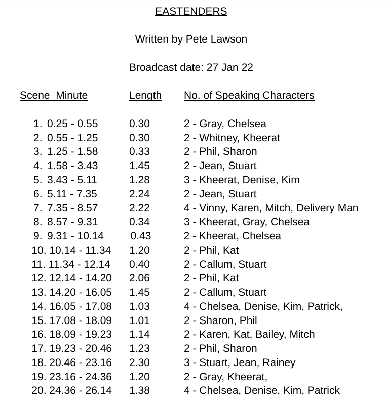 - Scenes 10 & 12 together are 1 scene and is the longest scene (3.26)