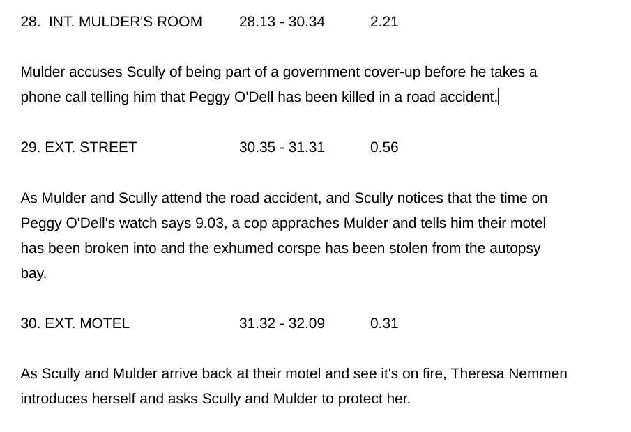 As I work through the step outline in the way Syd Field teaches in his book Screenplay – writing one sentence per scene – I noticed how Chris Carter follows the same structure in each scene in order to provide new information which moves the story forward.