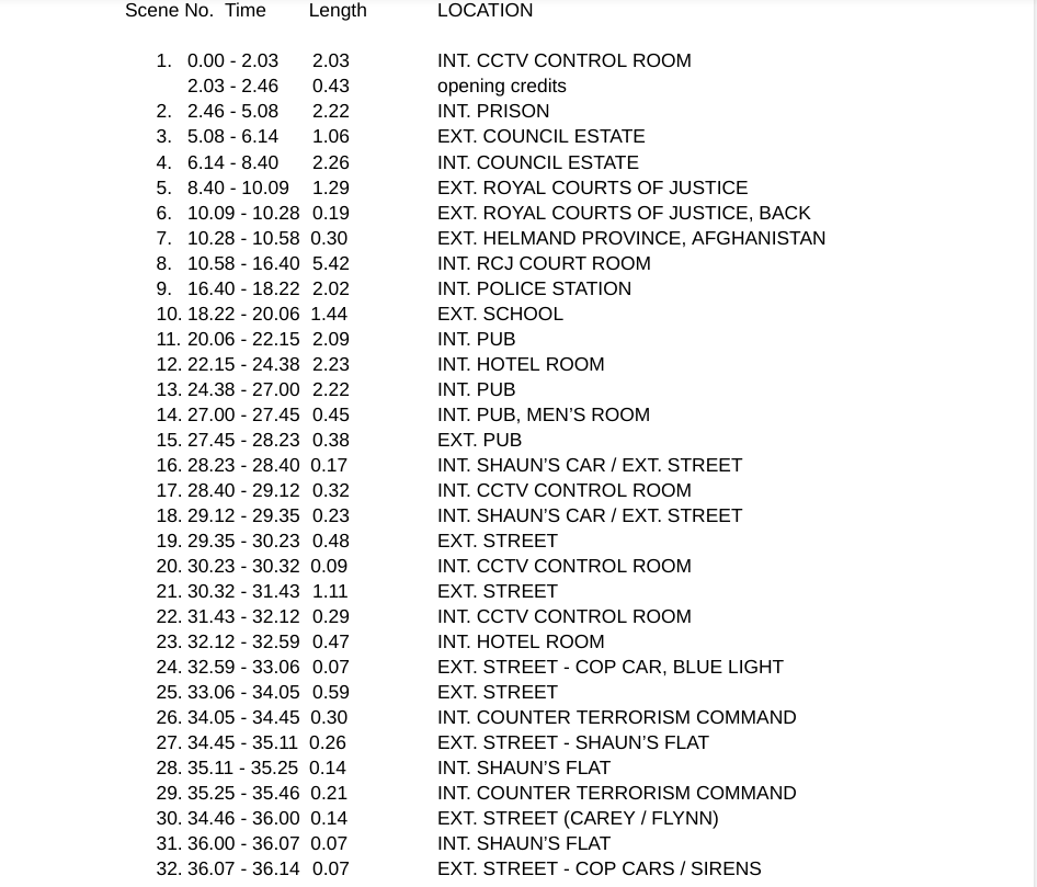 Here is a scene length breakdown of the first episode of The Capture (screenwriter Ben Chanan).