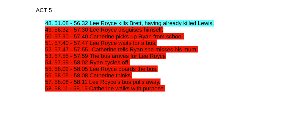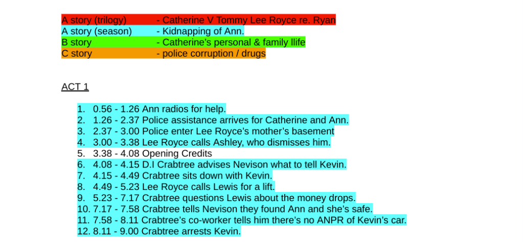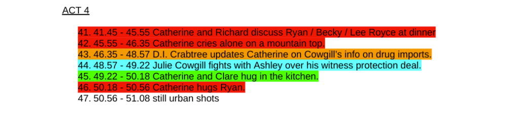 Whereas in episode 1, act 5 is colour-coded mostly blue – dealing with the A story (season) main plot, as we near the season finale of episode 6, act 5 of episode 5 is mostly red – dealing with the A story (trilogy).