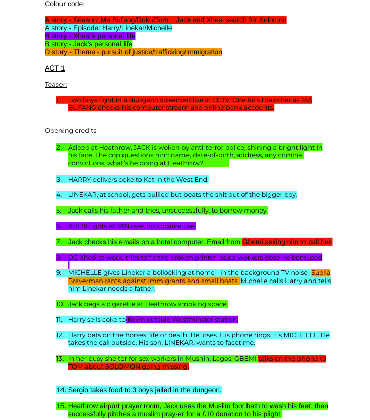 Here is the way I have colour coded the first act, inspired by my analysis of the structure of Happy Valley.